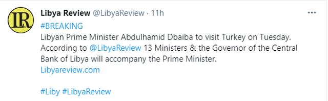 Ο μεταβατικός (υπηρεσιακός) πρωθυπουργός της Λιβύης, Αμπντούλ Χαμίντ Ντμπεϊμπά, θα επισκεφθεί την Τουρκία την Τρίτη, μετέδωσε το Libya Review.