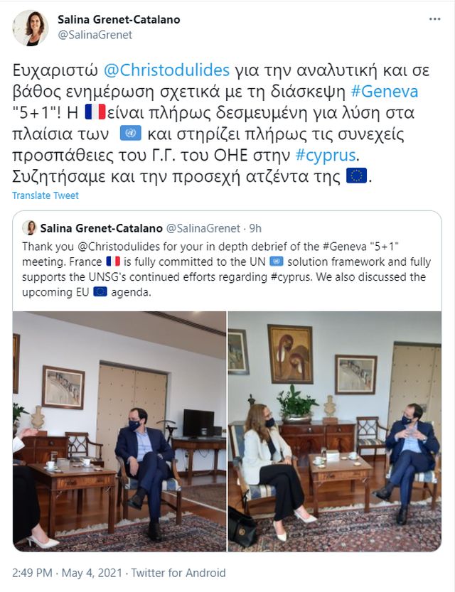 Σε ανάρτησή της στο Τwitter, η κ. Γκρενέτ-Καταλάνο ευχαρίστησε τον κ. Χριστοδουλίδη για την εις βάθος ενημέρωση σε σχέση με την άτυπη διάσκεψη τύπου 5+1 στη Γενεύη.