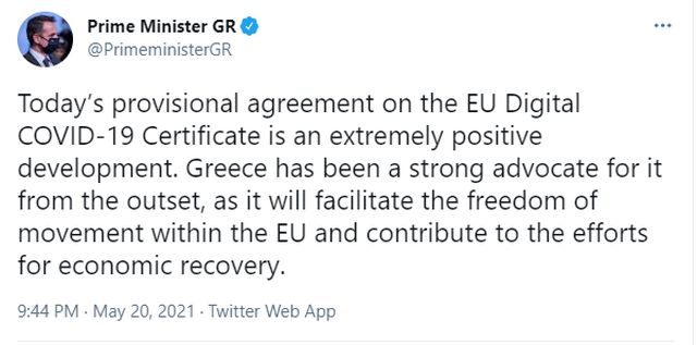 »Η Ελλάδα υπήρξε εξ αρχής ισχυρός υποστηρικτής της πρότασης, καθώς θα διευκολύνει την ελεύθερη μετακίνησε εντός της ΕΕ και θα συμβάλει στις προσπάθειες οικονομικής ανάκαμψης», έγραφε σε σχόλιό του στο Twitterο πρωθυπουργός.