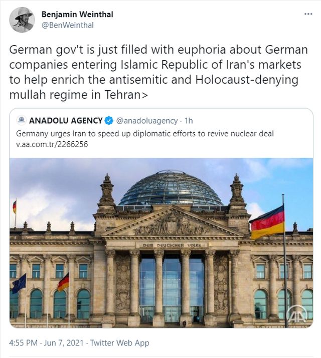 «Η γερμανική κυβέρνηση είναι απλώς γεμάτη ευφορία σχετικά με τις γερμανικές εταιρείες που εισέρχονται στις αγορές της Ισλαμικής Δημοκρατίας του Ιράν για να βοηθήσουν τον πλουτισμό του αντισημιτικού και αρνητών του Ολοκαυτώματος καθεστώτος της Τεχεράνης», σχολιάζει με ανάρτησή του στο Twitter ο κορυφαίος δημοσιογράφος Μπέντζαμιν Γουάινταλ, ποστάροντας δημοσίευμα του τουρκικού πρακτορείου ειδήσεων Anadolu, το οποίο αναφέρει μεταξύ άλλων: