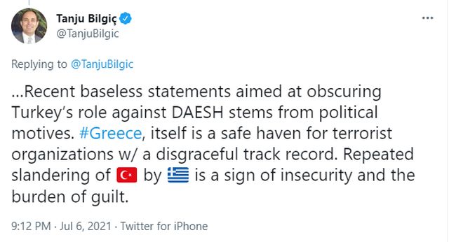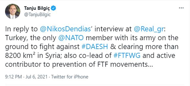 Ο εκπρόσωπος του υπουργείου Εξωτερικών Τανζού Μπιλγκίτς, μέσω tweet που απευθύνεται στον Έλληνα υπουργό Εξωτερικών Νίκο Δένδια είπε ότι η Τουρκία είναι η μόνη χώρα του ΝΑΤΟ που αγωνίζεται ενάντια στο DAESH (ISIS) (αλήθεια, πότε ακριβώς;) πριν πάθει υστερία: