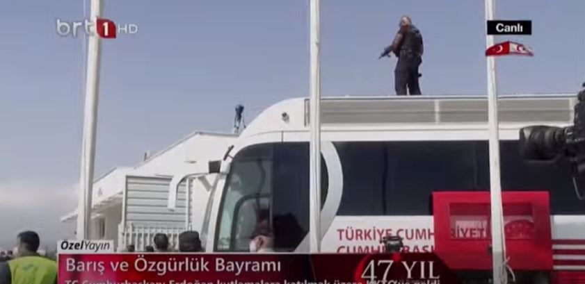 Χαρακτηριστικό των αυξημένων μέτρων ασφαλείας είναι και η παρουσία ελεύθερων σκοπευτών πάνω στο λεωφορείο που μετέφερε τον Τούρκο Πρόεδρο και την αντιπροσωπεία του.