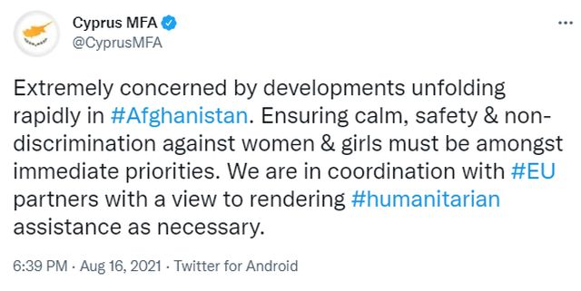 Τη βαθύτατη ανησυχία του εξαιτίας των εξελίξεων που διαδραματίζονται με ταχείς ρυθμούς στο Αφγανιστάν εξέφρασε τη Δευτέρα το Υπουργείο Εξωτερικών της Κύπρου.
