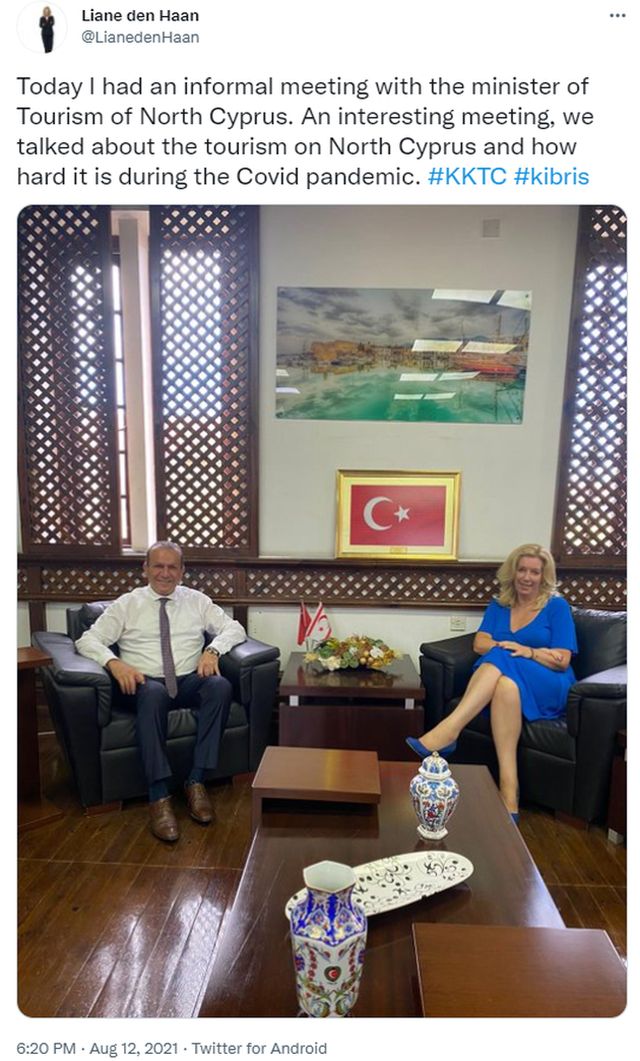 Όπως αναφέρει στην ανάρτησή της η κ. Ντεν Χάαν, είχε μια «άτυπη συνάντηση με τον υπουργό Τουρισμού της Βόρειας Κύπρου (όπως αναφέρθηκε για τις κατεχόμενες περιοχές).