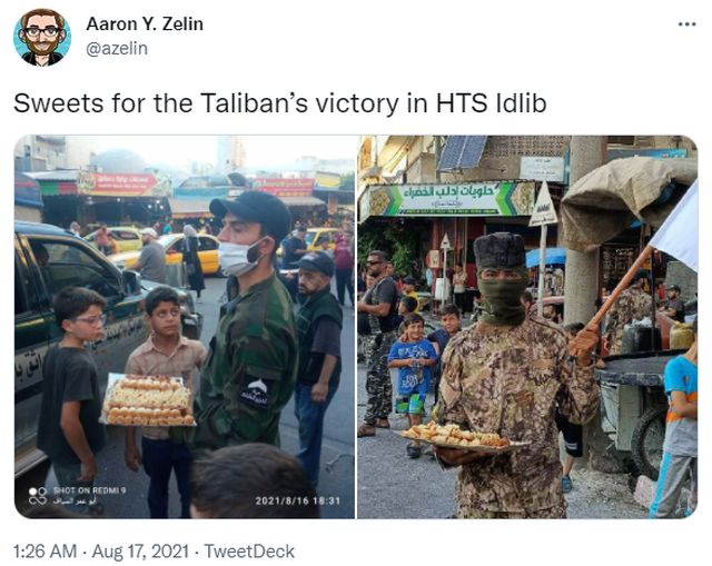 Η τζιχαντιστική συριακή ένοπλη παράταξη Χαγιάτ Ταχρίρ Αλ Σαμ (πρώην Αλ Νούσρα), το μεγαλύτερο παρακλάδι της Αλ Κάιντα στη Συρία, πανηγύρισε την κατάληψη της Καμπούλ από τους Ταλιμπάν.