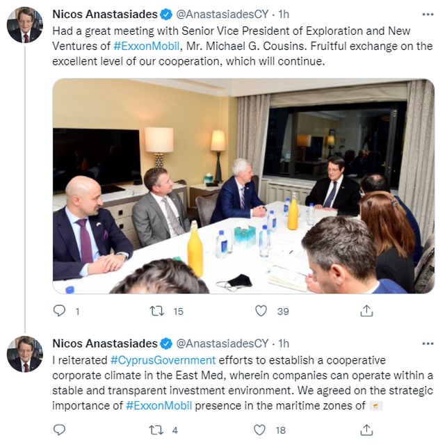 Συνάντηση με αντιπροσωπεία της ExxonMobil, με επικεφαλής τον Ανώτερο Αντιπρόεδρο της Μάικ Κάσινς (Mike Cousins), είχε στη Νέα Υόρκη ο Πρόεδρος της Κυπριακής Δημοκρατίας Νίκος Αναστασιάδης.