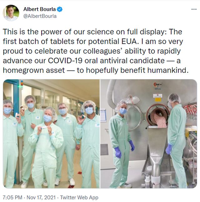 Μόλις μια μέρα μετά το αίτημα της Pfizer για την κατεπείγουσα έγκριση του πειραματικού αντιιικού χαπιού της για τη νόσο Covid-19, o CEO ης εταιρείας ανάρτησε στα social media δύο φωτογραφίες με τους ερευνητές την ώρα της παραγωγής των χαπιών αλλά και λίγο μετά κρατώντας στα χέρια τους το φαρμακευτικό σκεύασμα.