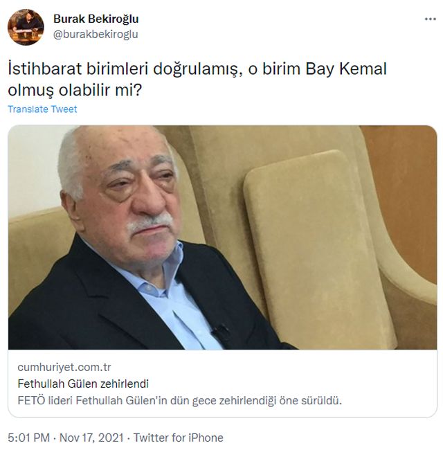 Συγκεκριμένα, ο δικηγόρος Burak Bekiroğlu, έγραψε στον λογαριασμό του στο Twitter, ότι ένας αξιωματικός της τουρκικής υπηρεσίας πληροφοριών εισχώρησε στην έπαυλη, όπου διέμενε ο αρχηγός του FETO, στην Πενσυλβάνια, και τον δηλητηρίασε.