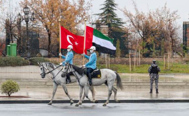 Ένα ιππικό ύψωσε τις σημαίες των δύο χωρών προτού ο σεΐχης Μοχάμεντ και ο κ. Ερντογάν κατευθυνθούν στο βάθρο καθώς ακούγονταν οι εθνικοί ύμνοι των ΗΑΕ και της Τουρκίας.