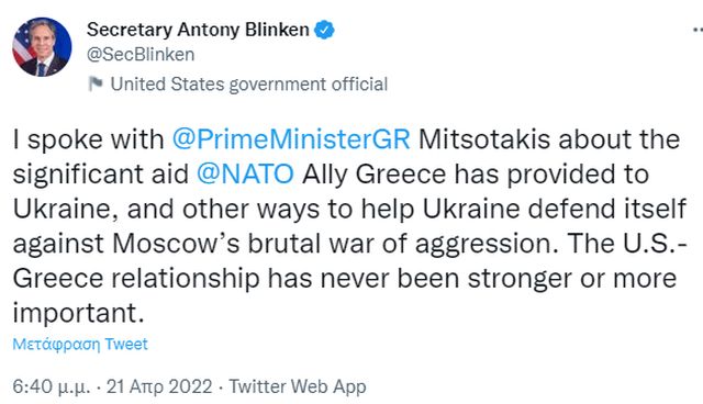 »Ελλάδα και ΗΠΑ συνεχίζουν τον στενό συντονισμό, ως σύμμαχοι στο ΝΑΤΟ, ενάντια στις απρόκλητες στρατιωτικές ρωσικές επιθέσεις στην Ουκρανία».