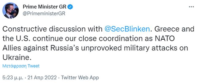 Σε ανάρτησή του στο twitter, ο κ. Μητσοτάκης χαρακτήρισε εποικοδομητική τη συνομιλία του με τον Αμερικανό ΥΠΕΞ, τονίζοντας ότι Ελλάδα και ΗΠΑ, ως σύμμαχοι του ΝΑΤΟ, συνεχίζουν τον στενό συντονισμό ενάντια στις απρόκλητες στρατιωτικές επιθέσεις της Ρωσίας στην Ουκρανία.