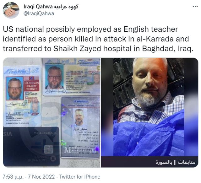 Η πηγή ασφαλείας επεσήμανε επιπλέον ότι ο Αμερικανός πολίτης εργαζόταν σε μια ανθρωπιστική οργάνωση στο Ιράκ.