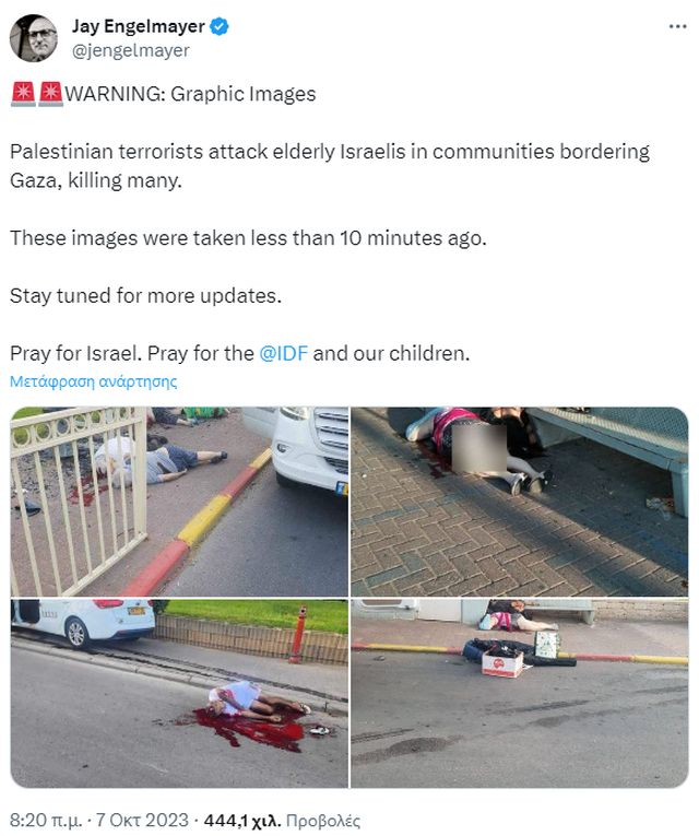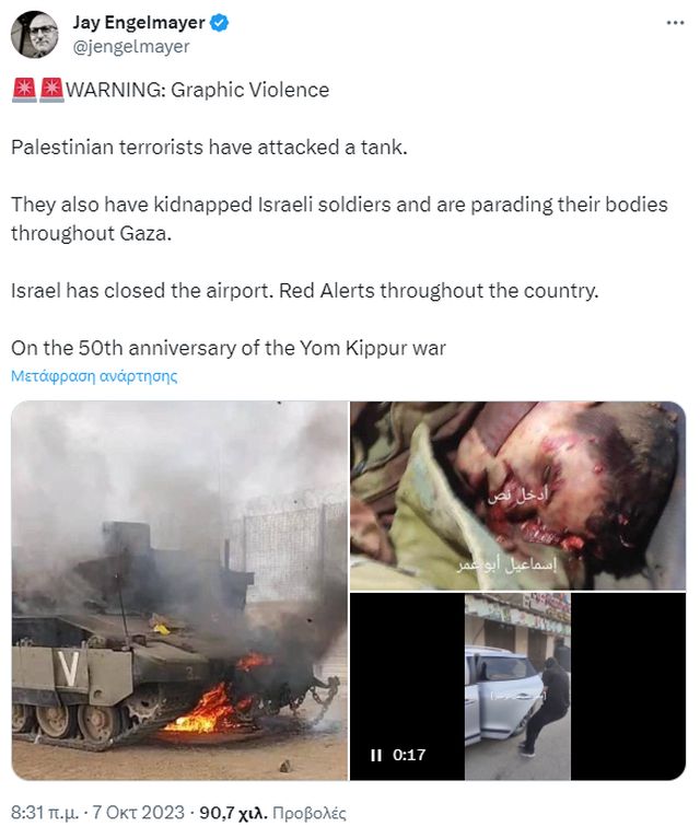Απρόκλητη επίθεση εξαπέλυσαν οι φιλότουρκοι τζιχαντιστές της Χαμάς στο Ισραήλ. Οι ισλαμιστές/τζιχαντιστές τρομοκράτες, από τη Λωρίδα της Γάζας που ελέγχουν, εξαπέλυσαν επίθεση με ρουκέτες στο Ισραήλ και ένοπλες συμμορίες τζιχαντιστών διείσδυσαν στις ισραηλινές πόλεις. Οι Παλαιστίνιοι φιλότουρκοι τρομοκράτες της Μουσουλμανικής Αδελφότητας έχουν πάρει Ισραηλινούς αμάχους. Σύμφωνα με εικόνες στο «Χ», πρώην Twitter, δεκάδες άμαχοι έχουν εκτελεστεί από τους Παλαιστίνιους τζιχαντιστές του Ερντογάν. Είναι σαφές ότι η Χαμάς κήρυξε απρόκλητα τον πόλεμο στο Ισραήλ.