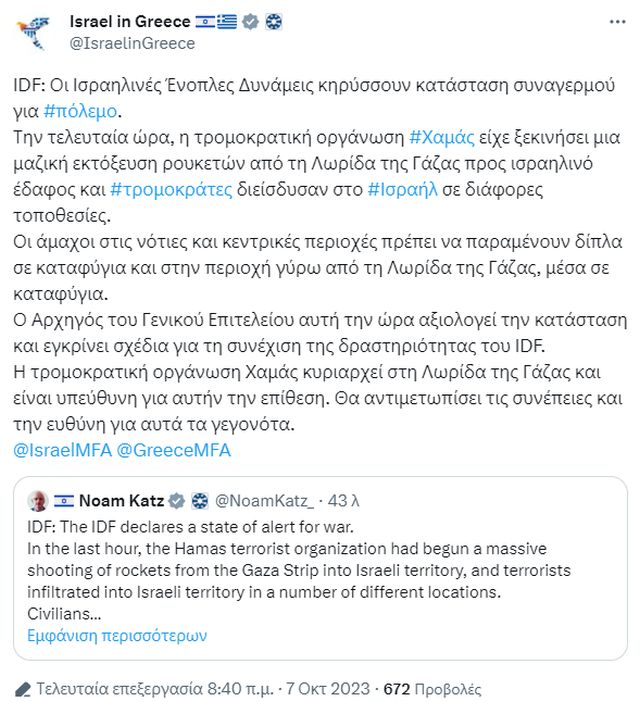 «Την τελευταία ώρα», αναφέρει η Ισραηλινή Πρεσβεία στην Αθήνα, «η τρομοκρατική οργάνωση Χαμάς είχε ξεκινήσει μια μαζική εκτόξευση ρουκετών από τη Λωρίδα της Γάζας προς ισραηλινό έδαφος και τρομοκράτες διείσδυσαν στο Ισραήλ σε διάφορες τοποθεσίες.