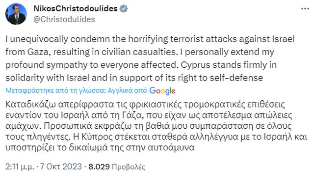 «Καταδικάζω απερίφραστα τις φρικιαστικές τρομοκρατικές επιθέσεις εναντίον του Ισραήλ από τη Γάζα, που είχαν ως αποτέλεσμα απώλειες αμάχων», αναφέρει σε μήνυμά του το απόγευμα του Σαββάτου 7/10 ο πρόεδρος της Κυπριακής Δημοκρατίας, κ. Νίκος Χριστοδουλίδης.