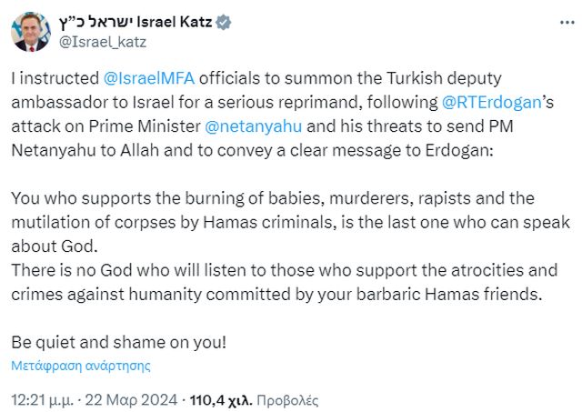 Σε απάντηση ο ισραηλινός υπουργός Εξωτερικών, Ίσραελ Κατζ, εξαπέλυσε πυρά κατά του Ερντογάν, σε ανάρτησή του στο «Χ», (πρώην twitter), με αφορμή τις χθεσινές δηλώσεις.
