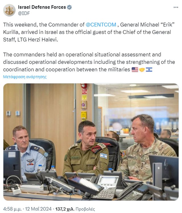 O επικεφαλής της Κεντρικής Διοίκησης των Ηνωμένων Πολιτειών (CENTCOM) στρατηγός Μάικλ Κουρίλα (Michael E. Kurilla) βρίσκεται στο Ισραήλ ως προσκεκλημένος του Αρχηγού του Επιτελείου των Ισραηλινών ενόπλων δυνάμεων (IDF), Στρατηγού Χέρτζι Τσαλέβι.