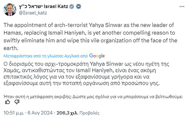Ο επικεφαλής της ισραηλινής διπλωματίας Ισραέλ Κατς υποστήριξε την Τρίτη 6/8 το βράδυ ότι ο διορισμός του Γιαχία Σινουάρ στην ηγεσία του πολιτικού γραφείου της Χαμάς είναι ακόμη ένας επιτακτικός λόγος για την εξόντωση του φερόμενου ως «εγκεφάλου» της επίθεσης της 7ης Οκτωβρίου.