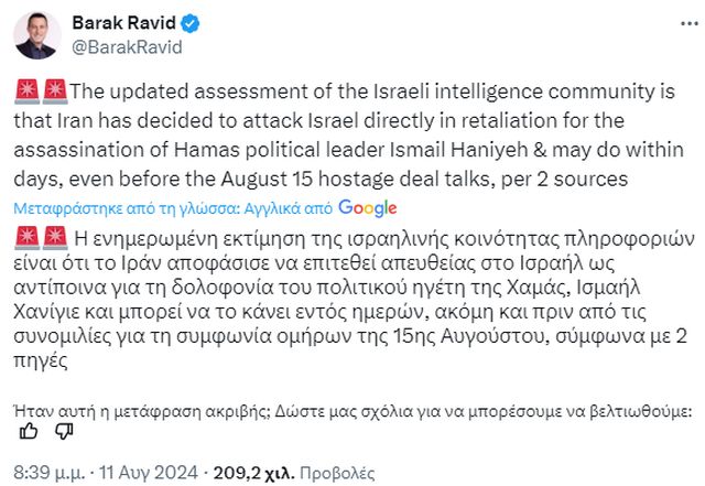 Η επίθεση θα γίνει ως αντίποινα για τη δολοφονία του ηγέτη της Χαμάς Ισμαήλ Χανίγιε στην Τεχεράνη στα τέλη Ιουλίου, πρόσθεσε ο Ραβίντ.