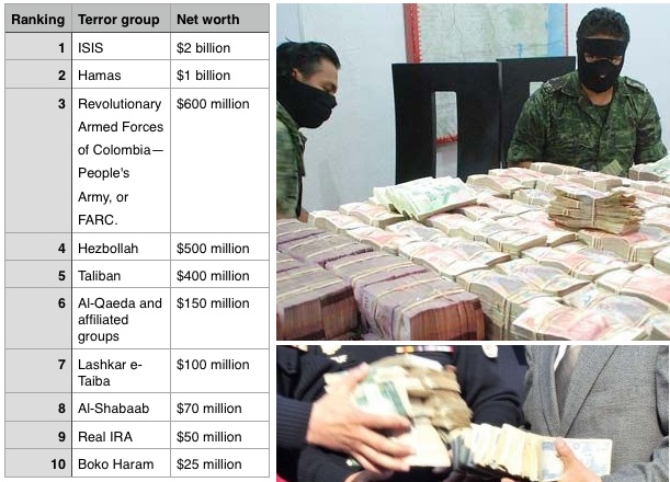 Το Ισλαμικό Κράτος είναι η πλουσιότερη τρομοκρατική οργάνωση στον κόσμο, με ετήσιο εισόδημα 3 δισ. δολαρίων και ακολουθεί, δεύτερη στη λίστα, η Χαμάς με ετήσιο εισόδημα 1 δισ. δολαρίων.