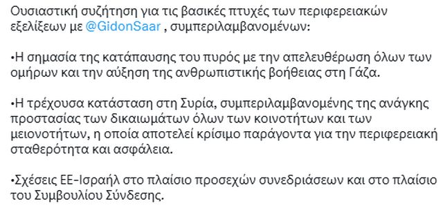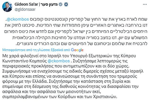 Σε δική του ανάρτηση, ο κ. Σαάρ, αναφέρει ότι συζήτησαν τις περιφερειακές προκλήσεις που αντιμετωπίζουν Ισραήλ και Κύπρος.