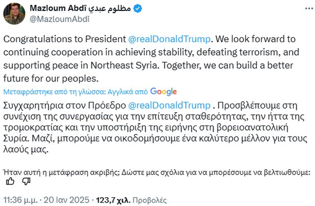 Ο Στρατηγός Μαζλούμ Άμπντι, Αρχηγός των υπό κουρδική διοίκηση Συριακών Δημοκρατικών Δυνάμεων (SDF), τη Δευτέρα 20/01/25 συνεχάρη τον Πρόεδρο των Ηνωμένων Πολιτειών, Ντόναλντ Τραμπ, για την ορκωμοσία του ως 47ου Προέδρου των Ηνωμένων Πολιτειών της Αμερικής.