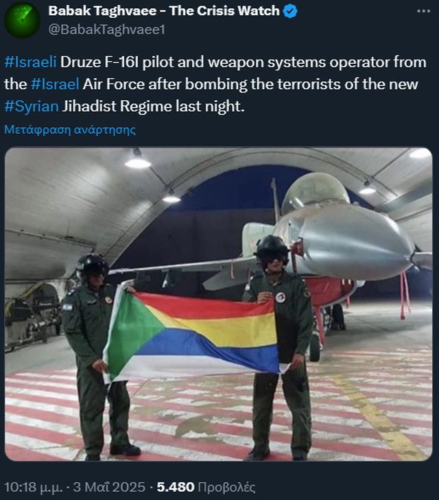 «Ισραηλινός πιλότος F-16I από τη μειονότητα των Δρούζων [του Ισραήλ] και χειριστής οπλικών συστημάτων της Ισραηλινής Αεροπορίας μετά τον βομβαρδισμό των τρομοκρατών του νέου Συριακού Τζιχαντιστικού Καθεστώτος χθες [Παρασκευή 02/05] βράδυ», αναφέρει σε ανάρτησή του στο «Χ», το Σάββατο 03/05, ο γνωστός διπλωματικός κι αμυντικός συντάκτης Μπαμπάκ Ταγβαΐ.