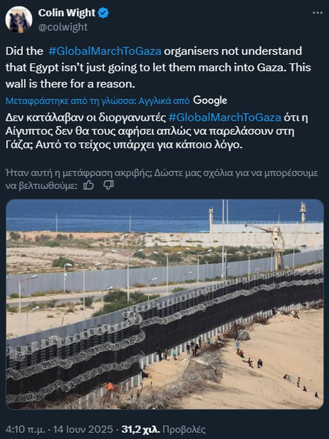 Αυτά είναι τα σύνορα της Αιγύπτου με τη Γάζα. Μια σειρά από πολλαπλά τείχη, φράχτες και ζώνες ασφαλείας που επιτηρούνται από στρατιώτες. Δεν ξέρω αν οι δυτικοί υπέρ των Παλαιστινίων το συνειδητοποιούν ή το αγνοούν, αλλά αυτή η σκληρή πραγματικότητα μόλις τους χτύπησε: