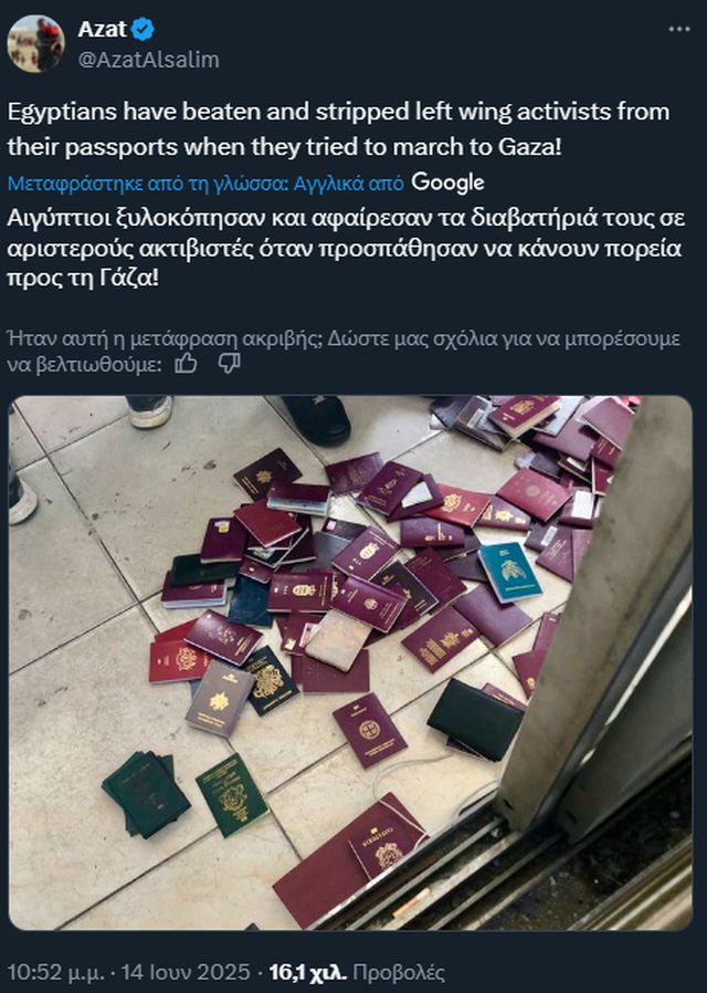 »Ντόπιοι Αιγύπτιοι συγκρούονται με τους δυτικούς ακροαριστερούς “χρήσιμους ηλίθιους” (μίνι-Γκρέτα Τούνμπεργκ) που ήθελαν να “πορευτούν στη Γάζα” και να “σπάσουν την πολιορκία”.