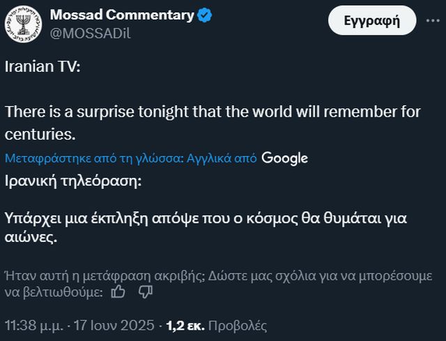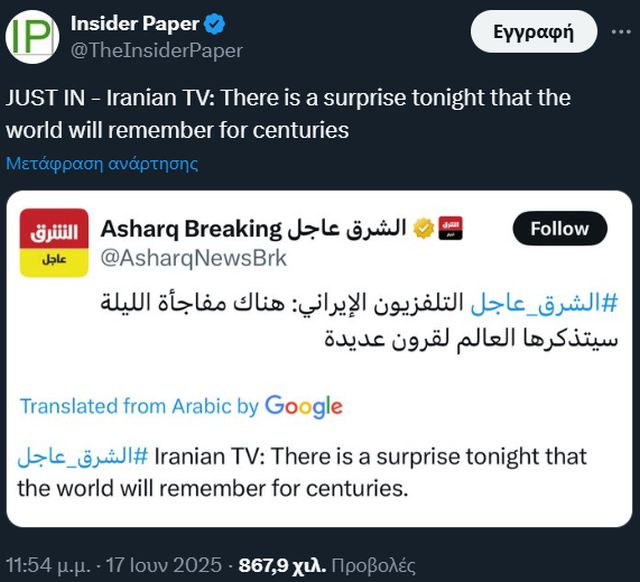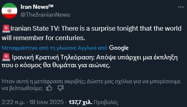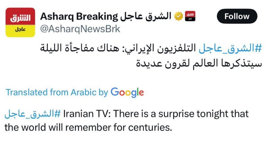 Ιρανική τηλεόραση: «Απόψε θα υπάρξει μια έκπληξη που ο κόσμος θα θυμάται για αιώνες», αναφέρει ανάρτηση στο «Χ».