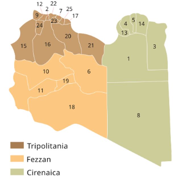 Ο έκπτωτος πρωθυπουργός Αμπντούλ Χαμίντ Ντμπεϊμπά ελέγχει τα εδάφη στη Δυτική Λιβύη χρώματος μωβ στον χάρτη και εδρεύει στην πρωτεύουσα Τρίπολη. Η υπόλοιπη Λιβύη ελέγχεται από τον Λιβυκό Εθνικό Στρατό (LNA υπό τη διοίκηση του στρατάρχη Χαλίφα Χάφταρ.