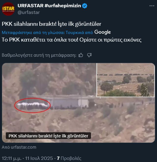 Σε κάθε περίπτωση, οι Κούρδοι αντάρτες που παραδίδουν τα όπλα τους δεν είναι περισσότεροι από 30. Η κεντρική φωτογραφία, την αλιεύσαμε από τουρκικά Μέσα, είναι τραβηγμένη από απόσταση και δείχνει την παράδοση των όπλων.