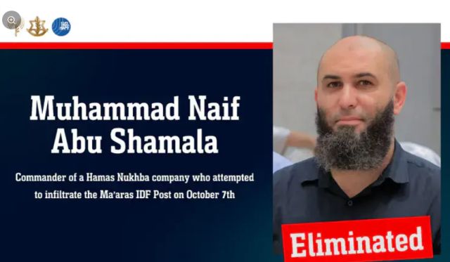 Την περασμένη εβδομάδα, στο νότιο τμήμα της Χαν Γιουνίς, στρατεύματα των Ισραηλινών Αμυντικών Δυνάμεων (IDF) εξουδετέρωσαν τον Μοχάμεντ Νάιφ Αμπού Σαμάλα, διοικητή της ελίτ μονάδας Νούχμπα της Χαμάς.