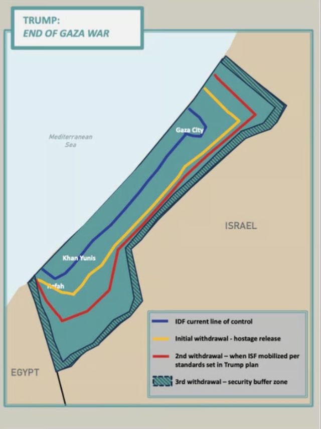 Το ολοκληρωμένο σχέδιο, το οποίο δημοσιοποιήθηκε λίγο πριν την προγραμματισμένη συνάντηση του Τραμπ με τον Ισραηλινό Πρωθυπουργό Μπέντζαμιν Νετανιάχου, συνοδεύεται από χάρτη που περιγράφει τη φάση αποχώρησης των ισραηλινών δυνάμεων.