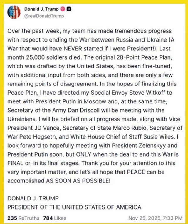 Ο Αμερικανός πρόεδρος ανακοινώνει ότι ο ειδικός απεσταλμένος του, Στιβ Γουίτκοφ, θα ταξιδέψει στη Μόσχα για να συναντηθεί με τον Βλαντιμίρ Πούτιν, καθώς όπως υποστηρίζει «υπάρχουν μόνο λίγα σημεία διαφωνίας που απομένουν» για να επιτευχθεί συμφωνία για την ειρήνη στην Ουκρανία.