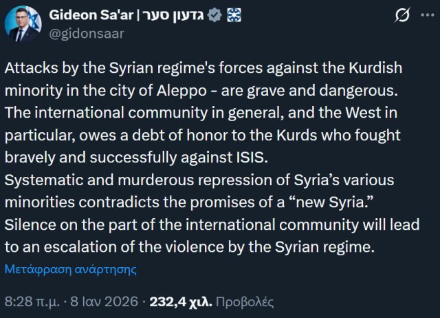 Την έντονη ανησυχία του για τις στρατιωτικές επιχειρήσεις του τζιχαντιστικού συριακού καθεστώτος εναντίον της κουρδικής μειονότητας στην πόλη του Χαλεπίου εξέφρασε το πρωί της Πέμπτης 08/01 ο Υπουργός Εξωτερικών του Ισραήλ, Γκιντεόν Σάαρ.