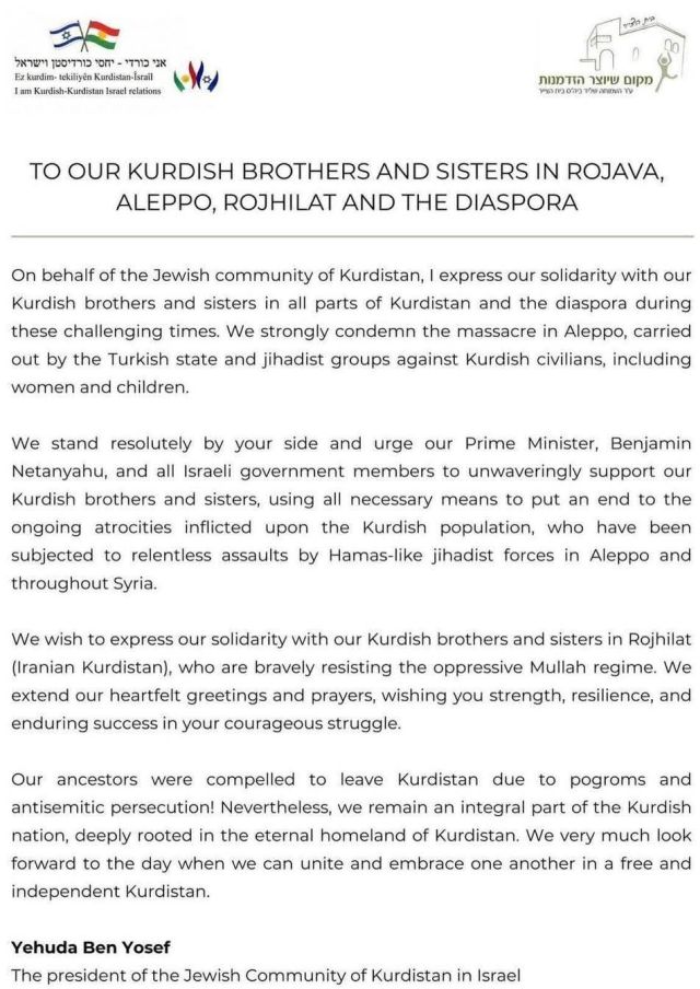 »Εκ μέρους της εβραϊκής κοινότητας του Κουρδιστάν, εκφράζουμε την πλήρη αλληλεγγύη μας προς τους Κούρδους αδελφούς και τις αδελφές μας σε ολόκληρο το Κουρδιστάν και τη διασπορά, κατά τη διάρκεια αυτών των δύσκολων ωρών.