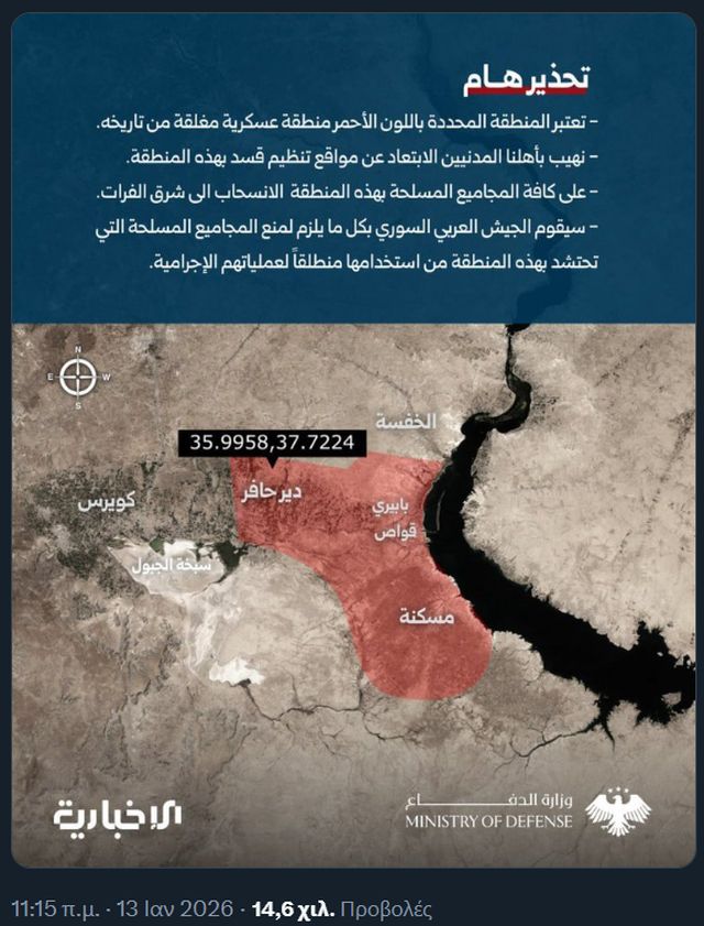 Τελεσίγραφο για αποχώρηση: Οι νεο-οθωμανικές συριακές ένοπλες δυνάμεις εξέδωσαν προειδοποίηση προς τις κουρδικές δυνάμεις, καλώντας τες να αποσυρθούν ανατολικά, εγκαταλείποντας τις περιοχές δυτικά του Ευφράτη που παραμένουν υπό τον έλεγχό τους.