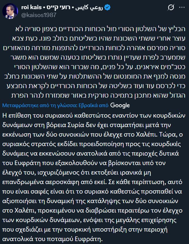 Σύμφωνα με ανάρτηση του Ισραηλινού δημοσιογράφου Ρόι Κάις στην πλατφόρμα «Χ», η επιθετική δραστηριότητα της ισλαμιστικής νεο-οθωμανικής μεταβατικής συριακής κυβέρνησης έναντι των κουρδικών δυνάμεων στη βόρεια Συρία κλιμακώνεται αδιάλειπτα.