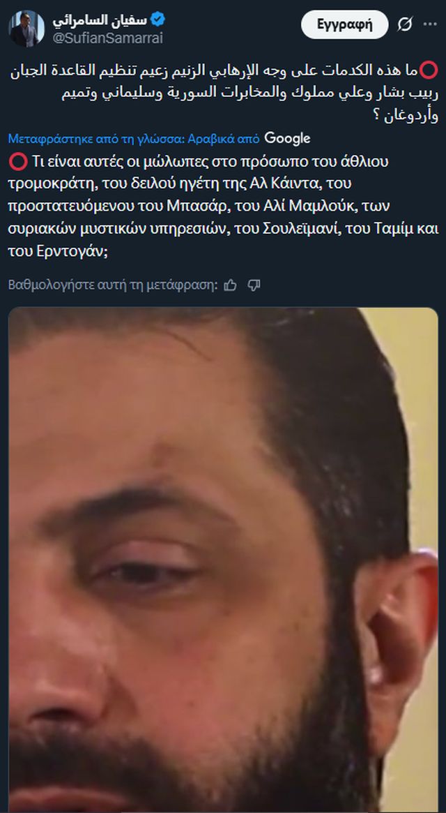 «Αυτές είναι οι εικόνες του Αλ Σαρά από τη συνέντευξη που μετέδωσε το κανάλι Al Ekhbariya. Παρατηρήστε τους μώλωπες στο πρόσωπό του· είναι πιο ξεκάθαροι και από το φως της ημέρας.