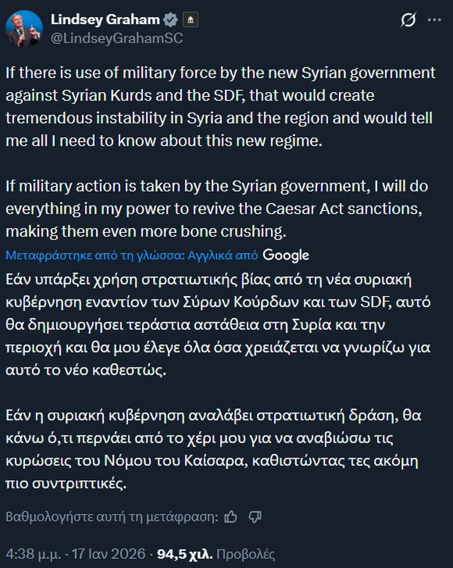Την έντονη αντίδραση του ισχυρού Ρεπουμπλικανού γερουσιαστή, Λίντσεϊ Γκράχαμ, προκάλεσε η παραβίαση της συμφωνίας κατάπαυσης του πυρός από δυνάμεις που πρόσκεινται στο νέο καθεστώς της Δαμασκού και φιλότουρκους τζιχαντιστές το Σάββατο 17 Ιανουαρίου.