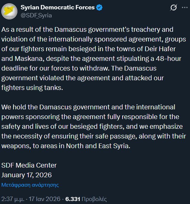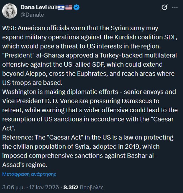 »Ο “πρόεδρος” αλ-Σαράα ενέκρινε μια πολυμερή επίθεση με την υποστήριξη της Τουρκίας εναντίον των συμμάχων των ΗΠΑ SDF, η οποία θα μπορούσε να επεκταθεί πέρα από το Χαλέπι, να διασχίσει τον Ευφράτη και να φτάσει σε περιοχές όπου εδρεύουν αμερικανικά στρατεύματα.