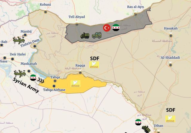 Την ίδια στιγμή, το Reuters μεταδίδει ότι ο [τζιχαντιστικός] συριακός στρατός έχει αποστείλει αθόρυβα ενισχύσεις προς το μέτωπο της Ντέιρ αλ Ζουρ, προετοιμάζοντας προφανώς μια νέα επιχείρηση για την κατάληψη τμημάτων του ανατολικού τμήματος της επαρχίας –της πλουσιότερης σε πετρέλαιο περιοχής της Συρίας– η οποία βρίσκεται σήμερα υπό τον έλεγχο των SDF στον ανατολικό Ευφράτη.