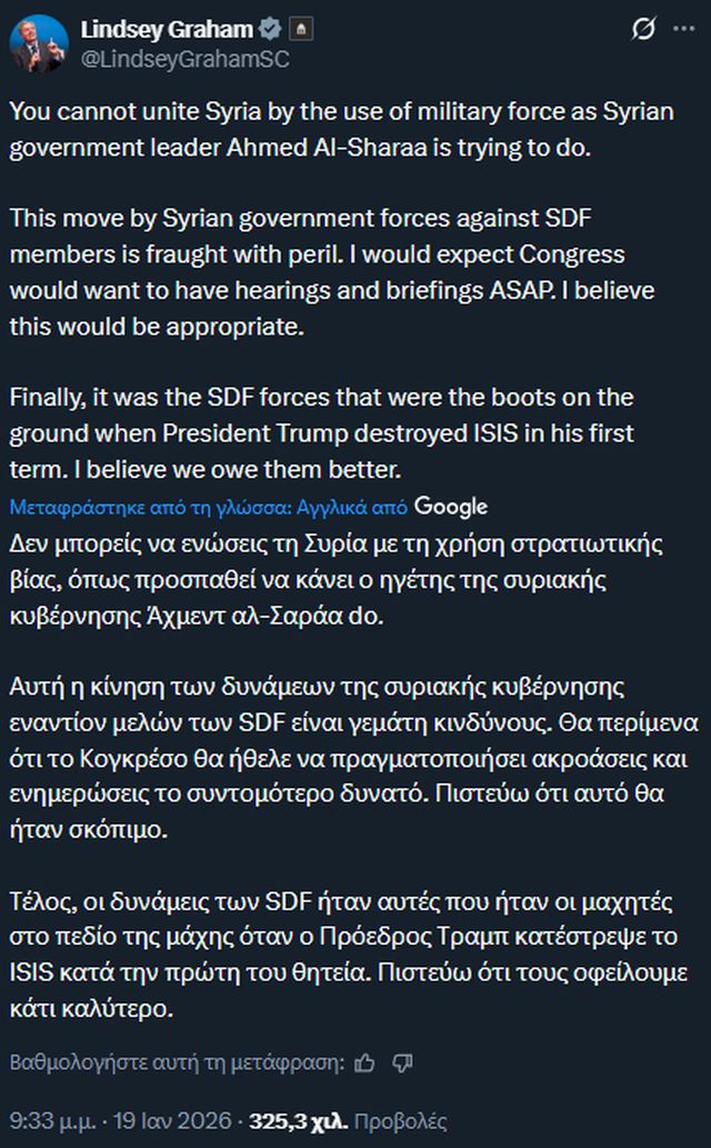Ο κορυφαίος Ρεπουμπλικανός γερουσιαστής, Λίντσεϊ Γκράχαμ, με νέα παρέμβασή του στην πλατφόρμα «X» τη Δευτέρα 19 Ιανουαρίου 2026, εξαπέλυσε νέες αιχμές κατά των χειρισμών της ισλαμιστικής μεταβατικής συριακής κυβέρνησης ενάντια στους Κούρδους (SDF) της Συρίας.