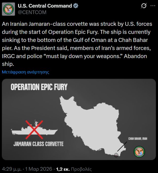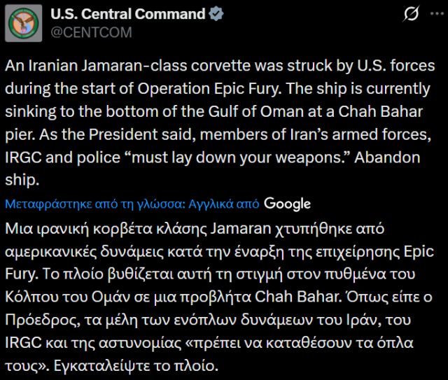 «Το ιρανικό σκάφος κλάσης “Τζαμαράν” δέχθηκε πλήγμα από τις αμερικανικές δυνάμεις και αυτή τη στιγμή βυθίζεται στον πυθμένα του Κόλπου του Ομάν», ανέφερε η CENTCOM.