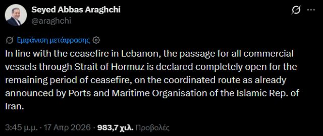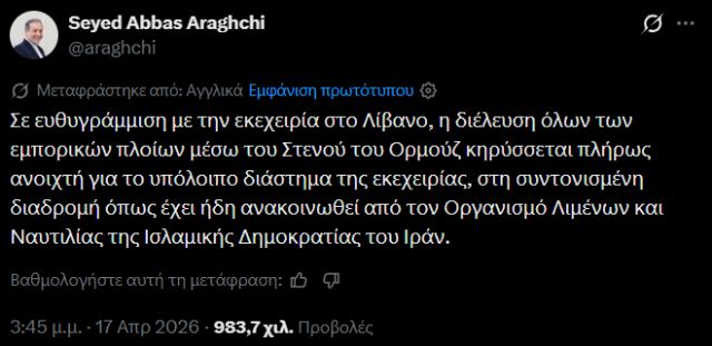 «Σε συμφωνία με την εκεχειρία στον Λίβανο, η διέλευση για όλα τα εμπορικά σκάφη μέσω των Στενών του Ορμούζ κηρύσσεται πλήρως ανοιχτή για το εναπομείναν διάστημα της κατάπαυσης του πυρός, μέσω της συντονισμένης διαδρομής που έχει ήδη ανακοινωθεί από τον Οργανισμό Λιμένων και Ναυτιλίας της Ισλαμικής Δημοκρατίας του Ιράν», έγραψε στην πλατφόρμα «X».