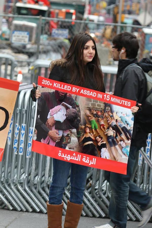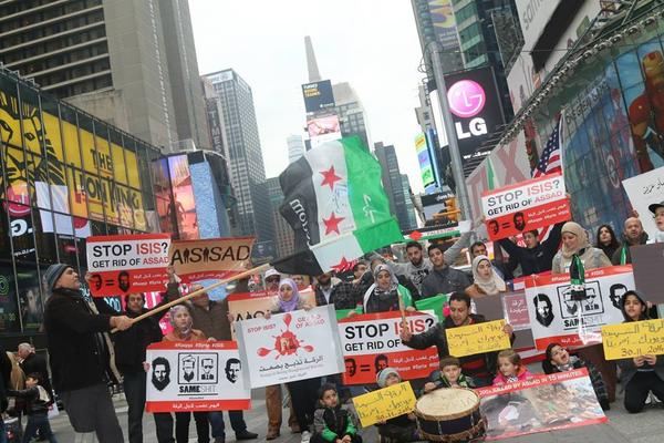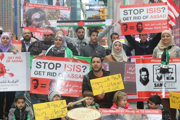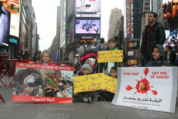 Στους δρόμους της Νέας Υόρκης μερικοί Σύροι αποφάσισαν να διαδηλώσουν σε ένδειξη συμπαράστασης και αλληλεγγύης στους κατοίκους της πόλης Ράκα, στη Συρία, η οποία έχει ανακηρυχθεί “πρωτεύουσα” του Ισλαμικού Κράτους και τις τελευταίες ημέρες δέχθηκε σφοδρούς βομβαρδισμούς από την κυβέρνηση της Συρίας.